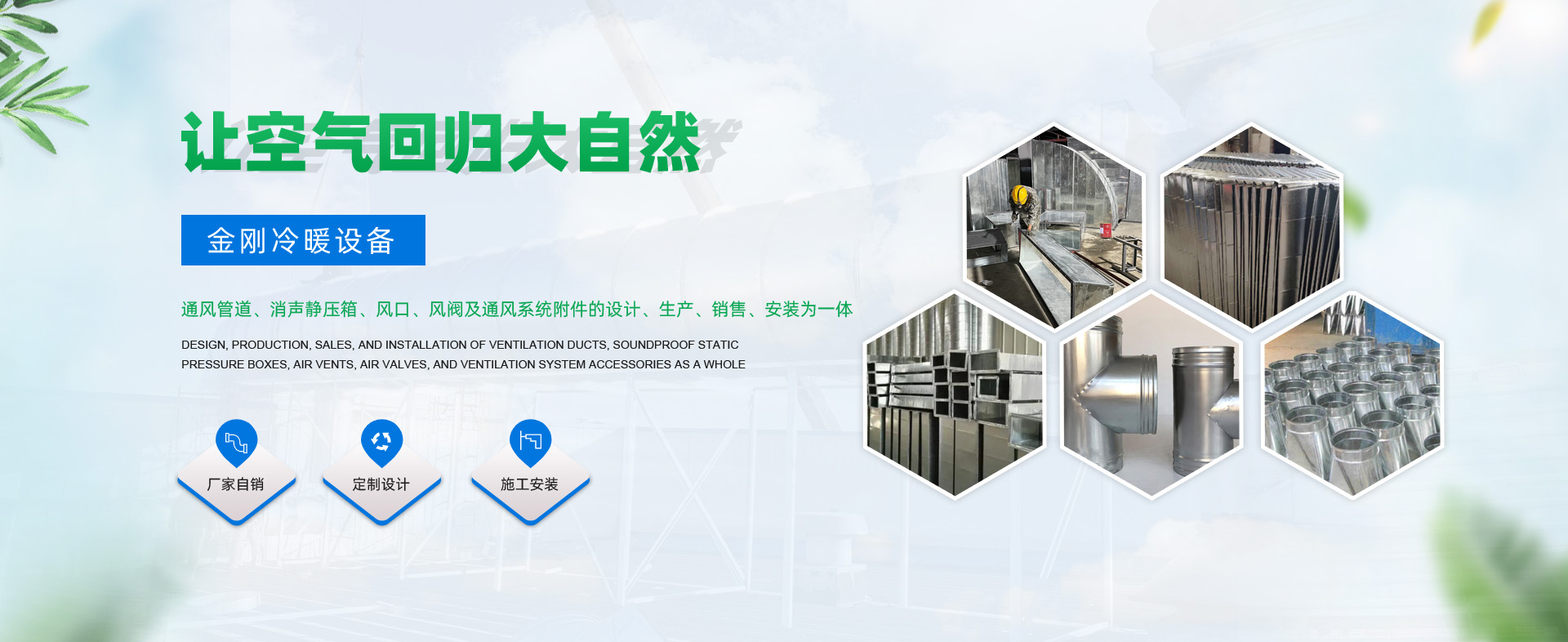 重慶金剛冷暖設備有限公司是集通風管道、消聲靜壓箱、風口、風閥及通風系統附件的設計、生產、銷售、安裝為一體的專業企業。擁有日生產、加工鍍鋅板、不銹鋼板、各型機制風管3000平方米的能力。我司產品形式多樣,結構新穎,連接牢靠,強度高、密封性好,符合規(guī)范、節(jié)省投資、安裝方便,能夠滿足廣大客戶的各種要求。公司堅持以“卓越、創(chuàng)新、快捷、誠信”的服務理念,為廣大客戶提供高質、高效、方便的服務。在完建的工程中取得了廣大客戶的一致好···